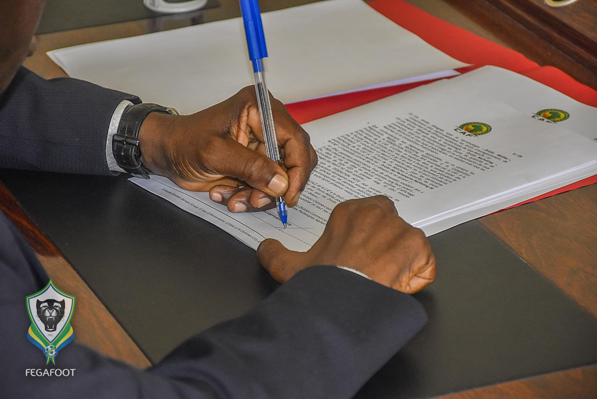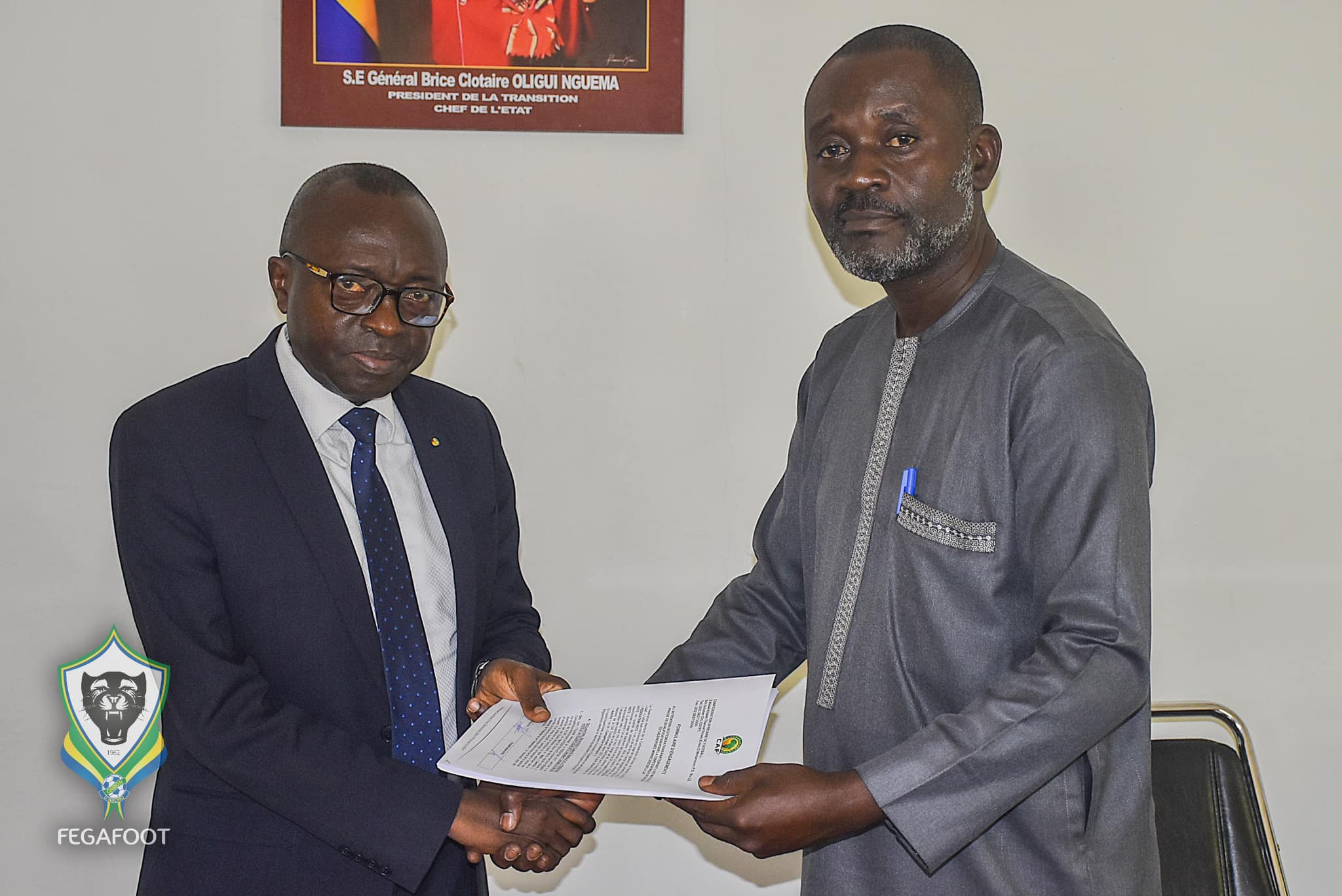 C’est en présence du Secrétaire général de la FEGAFOOT Yoland MAVOUROULOU en lieu et place du Président empêché et les deux présidents en charge des commissions communication et équipes nationales respectivement Armand MOULOUNGUI et Alfred MEBALE que la FEGAFOOT et GABON TV représentée par son DG EL MUTH MOUTSINGA BOULINGUI ont signé le formulaire d’engagement en terme de droit de la télévision partenaire avant la première journée des éliminatoires de la CAN 2025.
